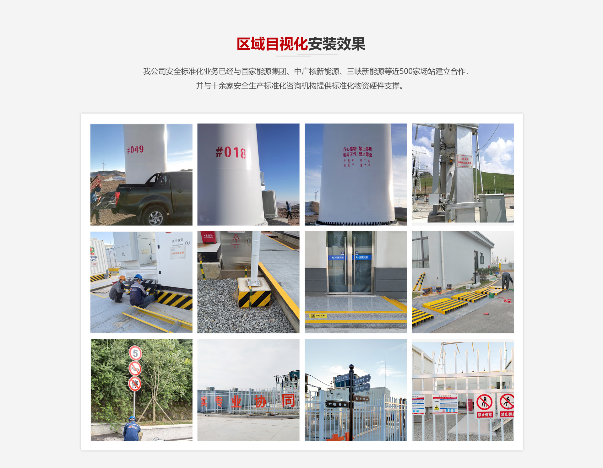 我公司安全標(biāo)準(zhǔn)化業(yè)務(wù)已經(jīng)與國家能源集團(tuán)、中廣核新能源、三峽新能源等近500家場站建立合作,并與十余家安全生產(chǎn)標(biāo)準(zhǔn)化咨詢機(jī)構(gòu)提供標(biāo)準(zhǔn)化物資硬件支撐。