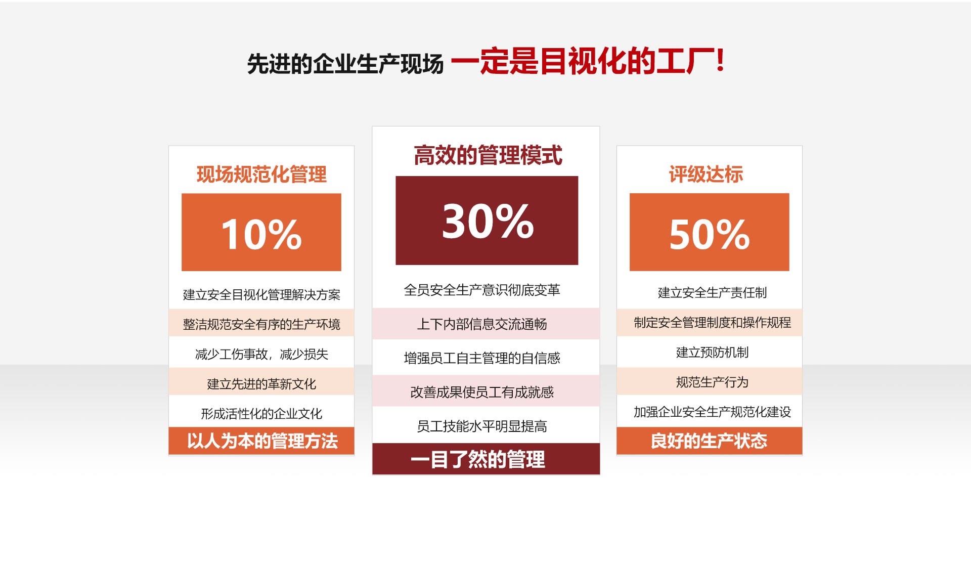 華泰安全目視化管理以安全法律、法規(guī)、標準和危害識別風險評價為基礎,運用標識警示、6S管理、看板管理、定置管理等方法,結合企業(yè)VI、生產的特點、安全管理現狀,將各方內容融合,策劃一套系統(tǒng)的安全目視化管理解決方案。