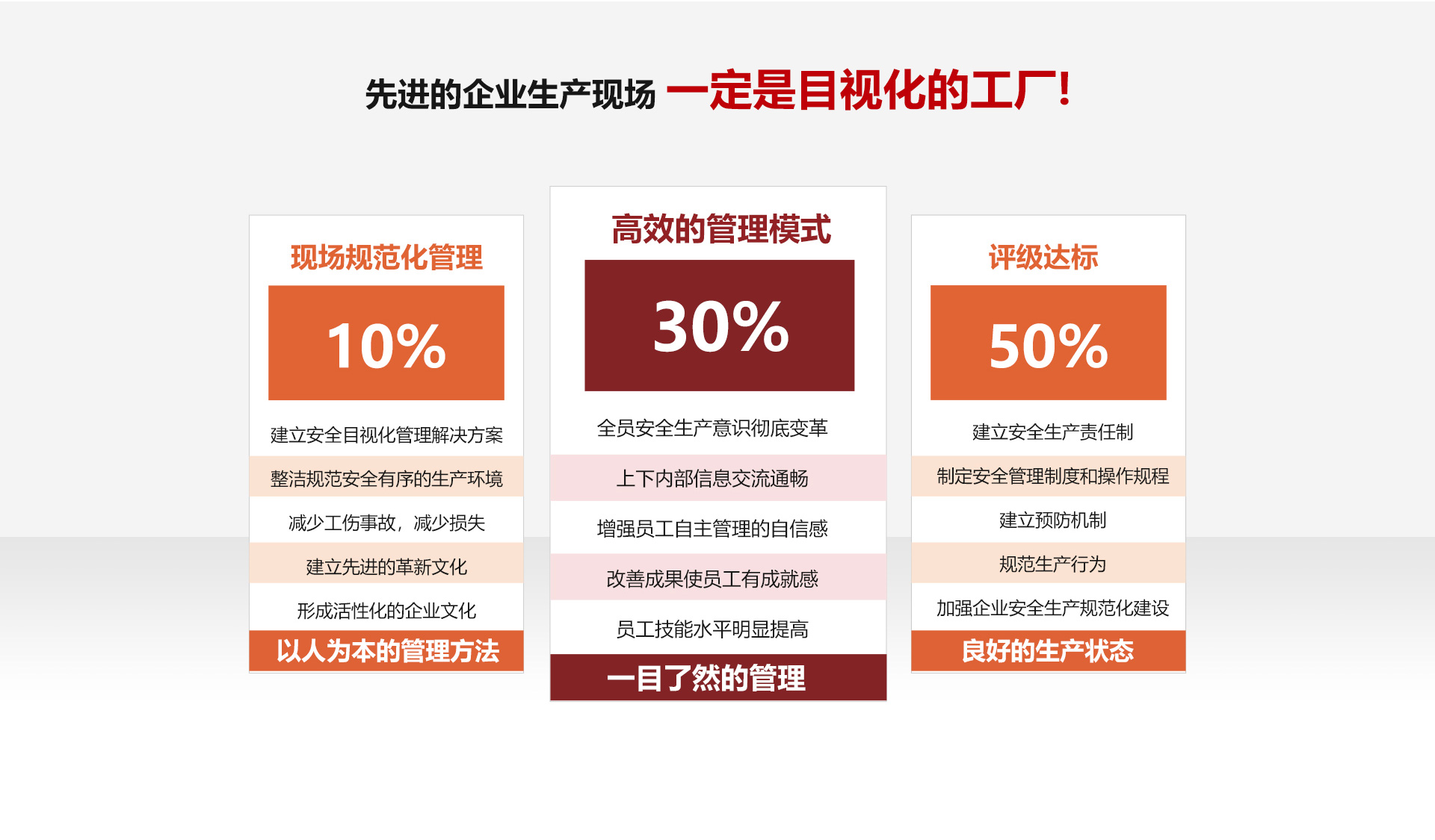 華泰安全目視化管理以安全法律、法規(guī)、標(biāo)準(zhǔn)和危害識別風(fēng)險評價為基礎(chǔ),運用標(biāo)識警示、6S管理、看板管理、定置管理等方法,結(jié)合企業(yè)VI、生產(chǎn)的特點、安全管理現(xiàn)狀,將各方內(nèi)容融合,策劃一套系統(tǒng)的安全目視化管理解決方案。