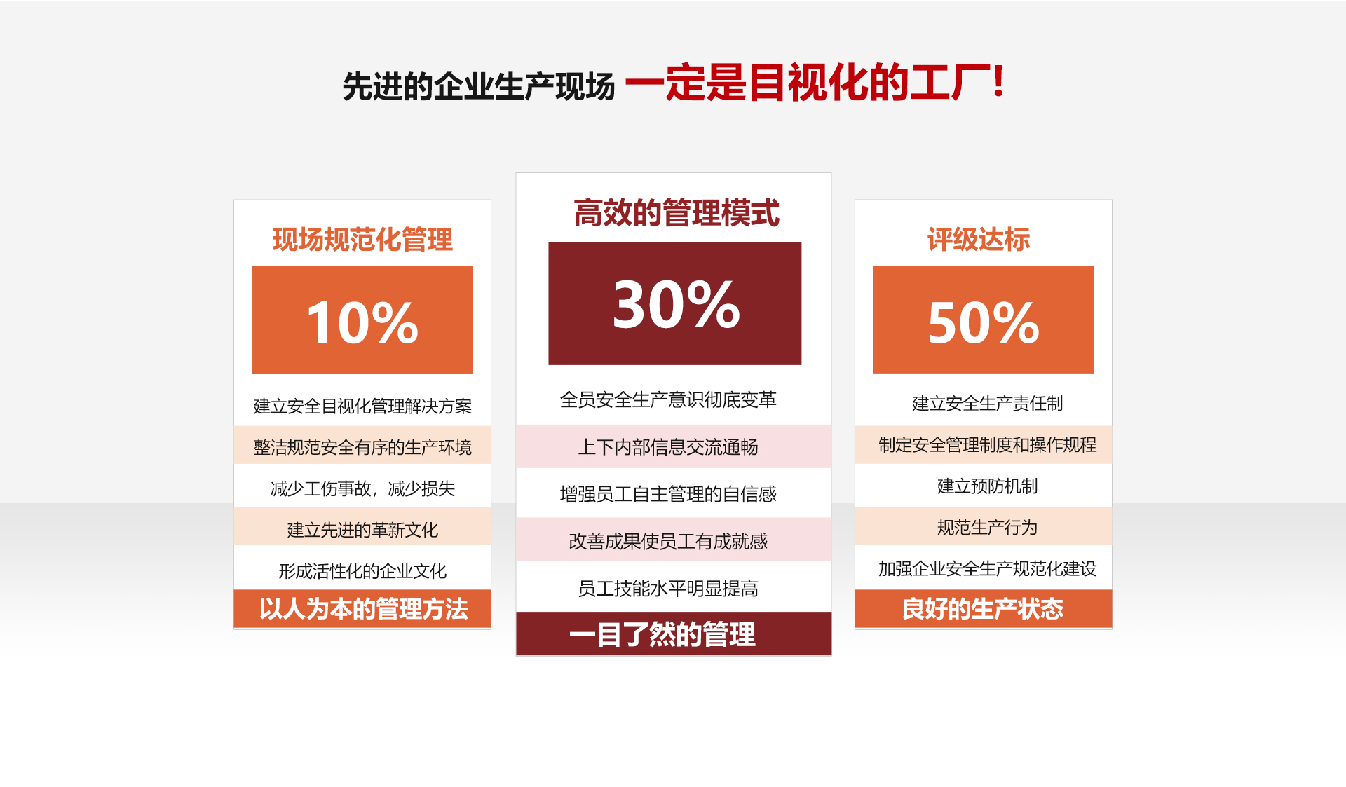 華泰安全目視化管理以安全法律、法規(guī)、標(biāo)準(zhǔn)和危害識別風(fēng)險評價為基礎(chǔ),運用標(biāo)識警示、6S管理、看板管理、定置管理等方法,結(jié)合企業(yè)VI、生產(chǎn)的特點、安全管理現(xiàn)狀,將各方內(nèi)容融合,策劃一套系統(tǒng)的安全目視化管理解決方案。